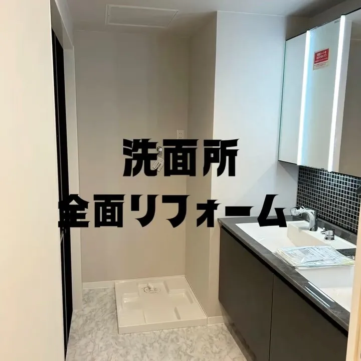 本日の施工例☆*:.。. o( 本日の施工例☆*:.。.o(洗面所一色リフォームでした🖤デザインを一新することで、洗面所は「ただ顔を洗う場所」から、ホテルライクでおしゃれな癒やしの空間へ!🤍#洗面デザイン#リフォーム#福岡市#内装工事#…